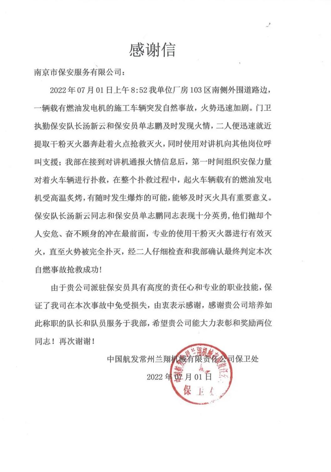 近期,心博官方网页版收到了一封来自中国航发常州兰翔机械有限责任公司保卫处的感谢信,信中对驻点保安员汤新云和单志鹏不顾自身安危、奋不顾身,及时处置火情保护驻点安全的行为表示衷心感谢。
