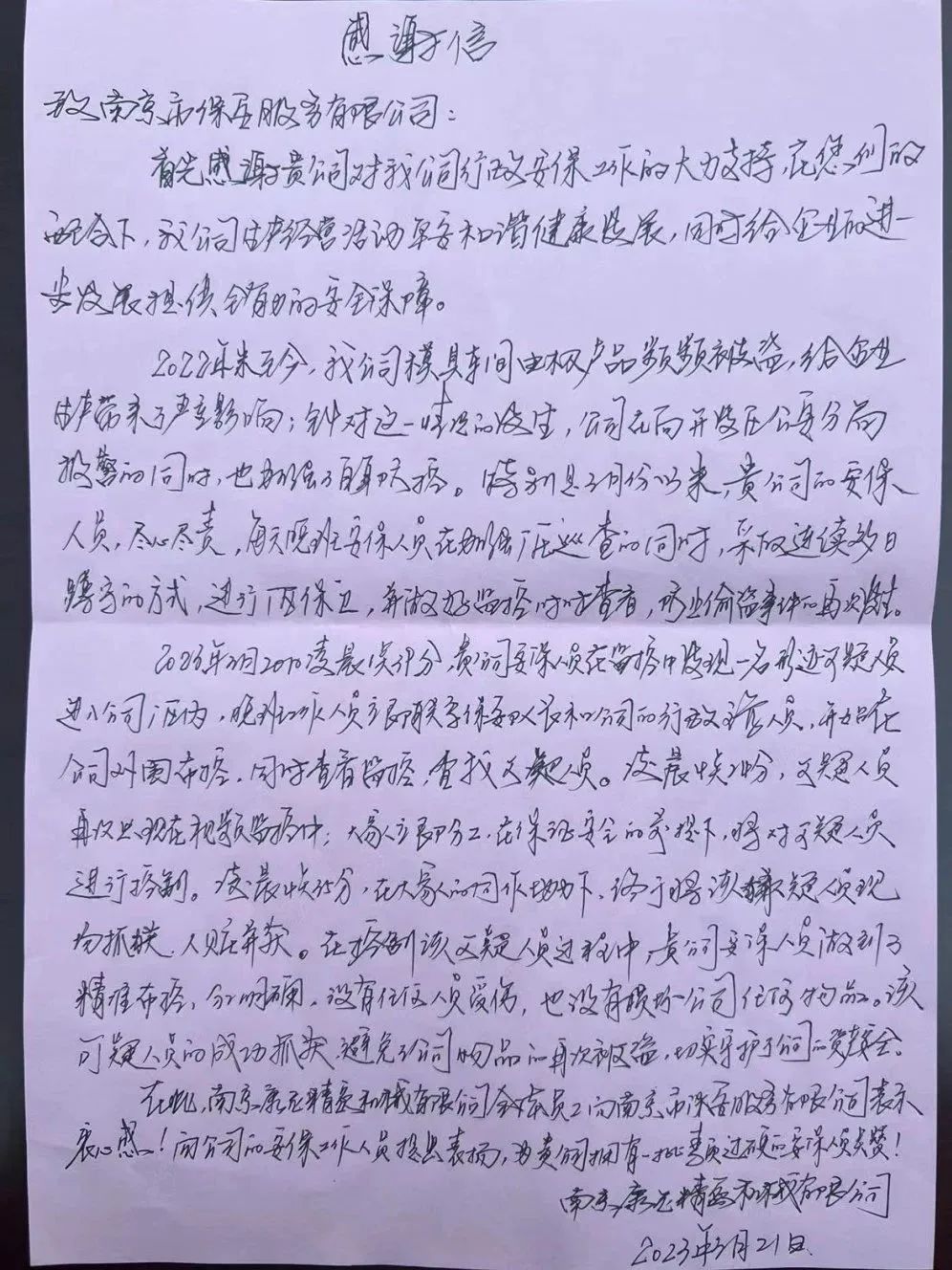 公司领导表示,保安员仅仅是做了分内工作就得到康尼集团如此高规格的表彰,我们深受鼓舞,感谢康尼集团对我司的信任和支持,让我们没有理由不把本职工作做好。公司6名保安员从发现可疑目标到精心布控再到奋不顾身勇擒窃贼,体现了南京市保人顽强的工作作风。为鼓励先进、树立典型,在全体员工中营造坚守初心、爱岗敬业、履职尽责的浓厚氛围,公司将予以表彰奖励。希望全体员工能够继续秉承“服务无极限、安全到永远”的服务理念为保障客户单位的平安做出自己的贡献。